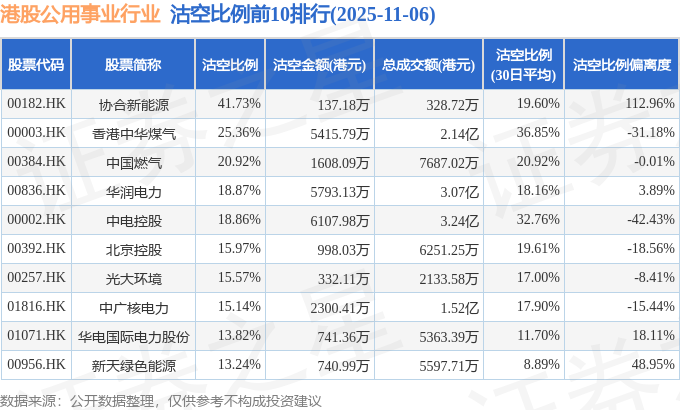 从沽空比例来看,协合新能源、香港中华煤气、中国燃气沽空比例位居行业前三,分别为41.73%、25.36%、20.92%。