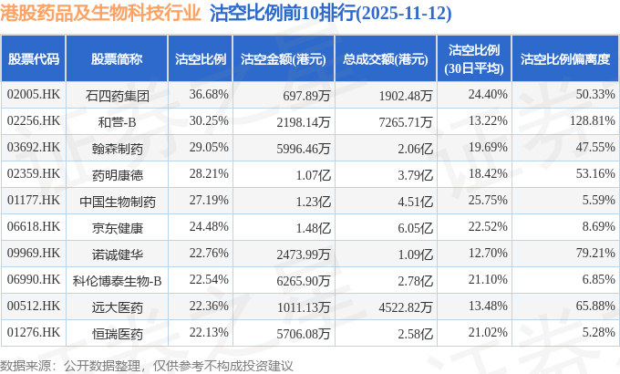 从沽空比例来看,石四药集团、和誉-B、翰森制药沽空比例位居行业前三,分别为36.68%、30.25%、29.05%。