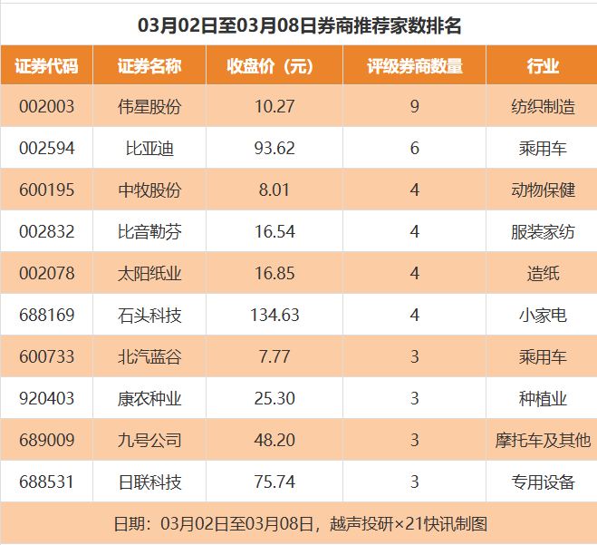 从券商推荐家数来看,3月2日至3月8日有176家上市公司得到券商推荐,其中伟星股份获得9家推荐,比亚迪获得6家推荐,中牧股份等获得4家推荐。